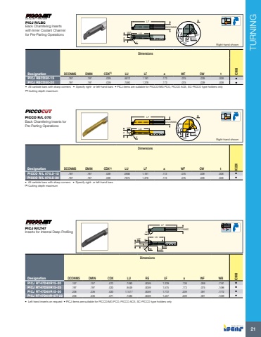 TURNING21LFDCONMSLUaWFX X8%u00b045%u00b0 WFCWt CDXRight-hand shownDimensionsDesignation DCONMS DMIN CDX(1) LU LF a WF CW t IC228PICCO R/L 070.5-15 .197 .197 .039 .5906 1.181 .173 .075 .039 .008 %u2022 PICCO R/L 070.5-20 .197 .197 .039 .7874 1.378 .173 .075 .039 .008 %u2022 %u2022 All carbide bars with sharp corners %u2022 Specify right- or left-hand bars(1) Cutting depth maximum PICCO R/L 070Back Chamfering Inserts for Pre-Parting OperationsLFDCONMSLUaWFX X8%u00b045%u00b0 WFCWt CDXRight-hand shownDimensionsDesignation DCONMS DMIN CDX(1) LU LF a WF CW t IC908PICJ RBCD50-15 .197 .197 .039 .5512 1.181 .173 .075 .039 .008 %u2022 PICJ RBCD50-20 .197 .197 .039 .7480 1.378 .173 .075 .039 .008 %u2022 %u2022 All carbide bars with sharp corners %u2022 Specify right- or left-hand bars %u2022 PICJ items are suitable for PICCO/MG PCO, PICCO ACE, SC-PICCO type holders only(1) Cutting depth maximum PICJ R/LBCBack Chamfering Inserts with Inner Coolant Channel for Pre-Parting Operations5%u00b047%u00b0a8%u00b0WBLFRE CDXWFDCONMSLUDimensionsDesignation DCONMS DMIN CDX LU RE LF a WF WB IC908PICJ RT47D40R15-20 .157 .157 .012 .7480 .0059 1.339 .138 .059 .1181 %u2022 PICJ RT47D50R15-25 .197 .197 .020 .9449 .0059 1.575 .173 .075 .1496 %u2022 PICJ RT47D60R15-30 .236 .236 .020 1.1417 .0059 1.772 .209 .091 .1772 %u2022 PICJ RT47D60R15T-22 .236 .236 .071 .7480 .0059 1.457 .209 .091 .1339 %u2022%u2022 Left hand inserts on request %u2022 PICJ items are suitable for PICCO/MG PCO, PICCO ACE, SC-PICCO type holders onlyPICJ R/LT47Inserts for Internal Deep Profiling