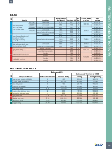 115GENERAL PURPOSE DRILLINGDR-DH ISO Material ConditionTensile Strength Rm [N/mm2] Hardness HBMtl. No.Cutting Speed vc m/minFeed mm/revPnon-alloy steel and cast steel, free cutting steel<0.25% C annealed 420 125 1100-1500.10-0.25%u22650.25% C annealed 650 190 2 0.10-0.25<0.55% C quenched and tempered 850 250 380-1500.15-0.30%u22650.55% Cannealed 750 220 4 0.15-0.30quenched and tempered 1000 300 5 0.15-0.30low alloy and cast steel (less than 5% of alloying elements)annealed 600 200 6 0.15-0.30quenched and tempered930 275 770-1200.15-0.301000 300 8 0.15-0.301200 350 9 0.15-0.30high alloyed steel, cast steel and tool steelannealed 680 200 10 80-150 0.10-0.25quenched and tempered 1100 325 11 70-120 0.10-0.25Kgray cast iron (GG) ferritic / pearlitic 180 15180-3000.18-0.35pearlitic / martensitic 260 16 0.18-0.35nodular cast iron (GGG)ferritic 160 17150-2500.15-0.30pearlitic 250 18 0.15-0.30malleable cast ironferritic 130 19 0.15-0.35pearlitic 230 20 0.15-0.35MULTI-FUNCTION TOOLSCutting speed (Vc)ISOWorkpiece Materials Material No. VDI 3323 Hardness (BHN)Cutting speed: Vc (m/min) for IC908Drilling Turning & BoringPlow carbon steel (<0.25% C) 1 ~150 130-240 150-270carbon steel (%u22650.25% C) 2 150-250 90-160 100-180low alloy steel 6 ~180 120-210 140-230medium alloy steel 7 200-250 70-140 80-160high alloy steel 8, 9 250-350 50-100 60-120martensitic stainless steel 12 200 110-180 130-200M austenitic stainless steel 14 200 90-160 100-180K grey cast iron 17, 18 180-220 110-180 120-200ductile cast iron 15, 16 200-240 90-160 100-180N aluminum alloy 21-24 60-130 100-500 150-600copper alloy 26-28 90-100 100-400 100-500
