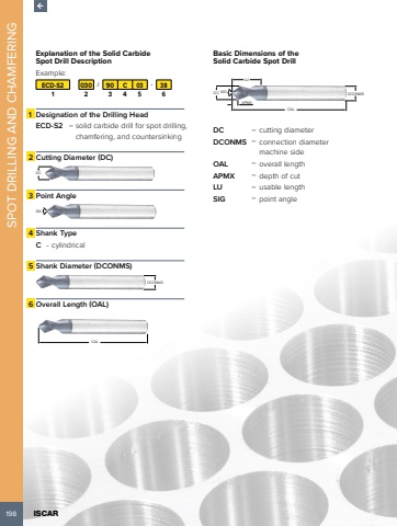 198 ISCAR SPOT DRILLING AND CHAMFERINGExplanation of the Solid Carbide Spot Drill Description Example:ECD-S2 030 / 90 C 03 - 381 2 3 4 5 61 Designation of the Drilling HeadECD-S2 %u2013 solid carbide drill for spot drilling, chamfering, and countersinking2 Cutting Diameter (DC)DC3 Point AngleSIG4 Shank TypeC - cylindrical5 Shank Diameter (DCONMS)DCONMS6 Overall Length (OAL)OALBasic Dimensions of the Solid Carbide Spot DrillLUSIG DCONMSOALDCAPMXDC %u2013 cutting diameterDCONMS %u2013 connection diameter machine sideOAL %u2013 overall lengthAPMX %u2013 depth of cutLU %u2013 usable lengthSIG %u2013 point angle