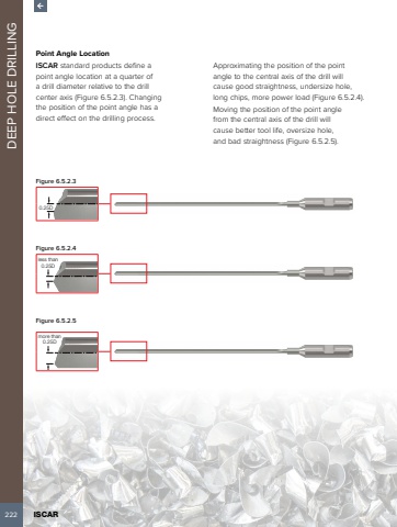 222 ISCAR DEEP HOLE DRILLINGPoint Angle LocationISCAR standard products define a point angle location at a quarter of a drill diameter relative to the drill center axis (Figure 6.5.2.3). Changing the position of the point angle has a direct effect on the drilling process.Approximating the position of the point angle to the central axis of the drill will cause good straightness, undersize hole, long chips, more power load (Figure 6.5.2.4).Moving the position of the point angle from the central axis of the drill will cause better tool life, oversize hole, and bad straightness (Figure 6.5.2.5).Figure 6.5.2.30.25DFigure 6.5.2.4less than 0.25DFigure 6.5.2.5more than 0.25D