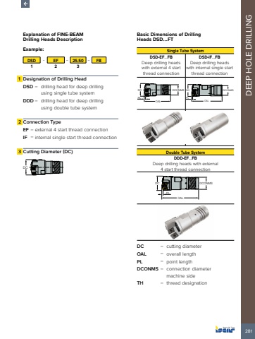 281DEEP HOLE DRILLINGExplanation of FINE-BEAM Drilling Heads DescriptionExample:DSD %u2013 EF %u2013 25.50 %u2013 FB1 2 31 Designation of Drilling HeadDSD %u2013 drilling head for deep drilling using single tube systemDDD %u2013 drilling head for deep drilling using double tube system2 Connection TypeEF %u2013 external 4 start thread connectionIF %u2013 internal single start thread connection3 Cutting Diameter (DC)DCBasic Dimensions of Drilling Heads DSD%u2026FTSingle Tube SystemDSD-EF%u2026FBDeep drilling heads with external 4 start thread connectionDSD-IF%u2026FBDeep drilling heads with internal single start thread connectionDCPLOALDCONMSOALDC DCONMSPLDRVS Wrench sizeDouble Tube SystemDDD-EF%u2026FBDeep drilling heads with external 4 start thread connectionDC DCONMSOALPLDC %u2013 cutting diameterOAL %u2013 overall lengthPL %u2013 point lengthDCONMS %u2013 connection diameter machine sideTH %u2013 thread designation