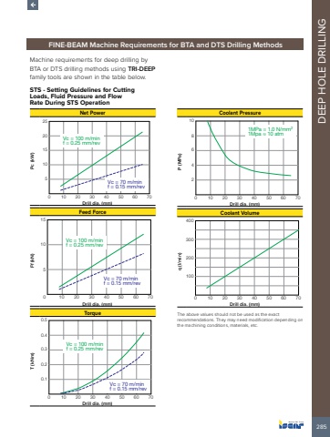 285DEEP HOLE DRILLINGFINE-BEAM Machine Requirements for BTA and DTS Drilling MethodsMachine requirements for deep drilling byBTA or DTS drilling methods using TRI-DEEPfamily tools are shown in the table below.STS - Setting Guidelines for CuttingLoads, Fluid Pressure and FlowRate During STS OperationNet PowerPc (kW)0 10 20 30 40 50 60 70510152025Vc = 100 m/minf = 0.25 mm/revVc = 70 m/minf = 0.15 mm/revDrill dia. (mm)Feed ForceFf (kN)0 10 20 30 40 50 60 7051015Vc = 100 m/minf = 0.25 mm/revVc = 70 m/minf = 0.15 mm/revDrill dia. (mm)TorqueT (kNm)0 10 20 30 40 50 60 700.10.20.30.40.5Vc = 100 m/minf = 0.25 mm/revVc = 70 m/minf = 0.15 mm/revDrill dia. (mm)Coolant PressureP (MPa)0 10 20 30 40 50 60 702468101MPa = 1.0 N/mm21Mpa %u2248 10 atmDrill dia. (mm)Coolant Volumeq (l/min)0 10 20 30 40 50 60 70100200300400Drill dia. (mm)The above values should not be used as the exact recommendations. They may need modification depending on the machining conditions, materials, etc.