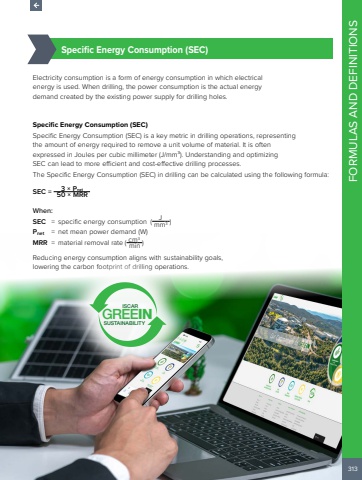 313FORMULAS AND DEFINITIONS%u00bd%u0009Specific Energy Consumption (SEC)Electricity consumption is a form of energy consumption in which electrical energy is used. When drilling, the power consumption is the actual energy demand created by the existing power supply for drilling holes.Specific Energy Consumption (SEC)Specific Energy Consumption (SEC) is a key metric in drilling operations, representing the amount of energy required to remove a unit volume of material. It is often expressed in Joules per cubic millimeter (J/mm%u00b3). Understanding and optimizing SEC can lead to more efficient and cost-effective drilling processes.The Specific Energy Consumption (SEC) in drilling can be calculated using the following formula:SEC = 3 %u00d7 Pnet 50 %u00d7 MRR When:SEC = specific energy consumption ( J mm3 )Pnet = net mean power demand (W)MRR = material removal rate ( cm3min )Reducing energy consumption aligns with sustainability goals, lowering the carbon footprint of drilling operations.SUSTAINABILITYISCARGREEIN