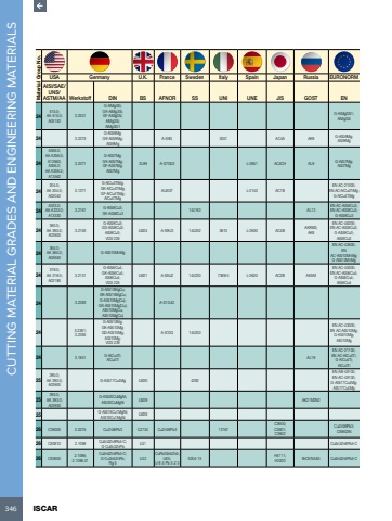 346 ISCAR CUTTING MATERIAL GRADES AND ENGINEERING MATERIALS Material Group No.USA Germany U.K. France Sweden Italy Spain Japan Russia EURONORMAISI/SAE/UNS/ASTM/AA Werkstoff DIN BS AFNOR SS UNI UNE JIS GOST EN24515.0;AA 515.0;A051503.3241G-AlMg3Si;GK-AlMg3Si;GF-AlMg3Si;AlMg3Si;AlMg3Si1G-AlMg3Si1;AlMg3Si24 3.2373G-AlSi9Mg;GK-AlSi9Mg;AlSi9MgA-S9G 3051 AC4A AK9 G-AlSi9Mg;AlSi9Mg24A356.0;AA A356.0;A13560;A356.2;AA A356.2;A135623.2371G-AlSi7Mg;GK-AlSi7Mg;GF-AlSi7Mg;AlSi7Mg2L99 A-S7G03 L-2651 AC4CH AL9 G-AlSi7Mg;AlSi7Mg24204.0;AA 204.0;A020403.1371G-AlCu4TiMg;GK-AlCu4TiMg;GF-AlCu4TiMg;AlCu4TiMgAU5GT L-2140 AC1BEN AC-21000;EN AC-AlCu4TiMg;G-AlCu4TiMg24A333.0;AA A333.0;A133303.2161 G-AlSi8Cu3;GK-AlSi8Cu3 144163 AL13EN AC-AlSi8Cu3;EN AC-AlSi8Cu3;G-AlSi8Cu324380.0;AA 380.0;A038003.2163G-AlSi9Cu3;GD-AlSi9Cu3;AlSi9Cu3;VDS 226LM24 A-S9U3 144252 3610 L-2630 AC4B AK8M3;AK8EN AC-46200;EN AC-AlSi8Cu3;G-AlSi9Cu3;AlSi8Cu324365.0;AA 365.0;A03650G-AlSi10MnMgEN AC-43500;EN AC-AlSi10MnMg;G-AlSi10MnMg24319.0;AA 319.0;A031903.2151G-AlSi6Cu4;GK-AlSi6Cu4;AlSi6Cu4;VDS 225LM21 A-S5UZ 144230 7369/4 L-2620 AC2B AK5MEN AC-45000;EN AC-AlSi6Cu4;G-AlSi6Cu4;AlSi6Cu424 3.2383G-AlSi10MgCu;GK-AlSi10MgCu;G-AlSi10Mg(Cu);GK-AlSi10Mg(Cu);AlSi10MgCu;AlSi10Mg(Cu)A-S10UG24 3.2381;3.2385G-AlSi10Mg;GK-AlSi10Mg;GD-AlSi10Mg;AlSi10Mg;VDS 239A-S10G 144253EN AC-43000;EN AC-AlSi10Mg;G-AlSi10Mg;AlSi10Mg24 3.1841 G-AlCu4Ti;AlCu4Ti AL19EN AC-21100;EN AC-AlCu4Ti;G-AlCu4Ti;AlCu4Ti25390.0;AA 390.0;A03900G-AlSi17Cu4Mg LM30 4282EN AB-48100;EN AC-48100;G-AlSi17Cu4Mg;AlSi17Cu4Mg25393.0;AA 393.0;A03930G-AlSi20CuMgNi;AlSi20CuMgNi LM29 AK21M2N225 G-AlSi18Cu1MgNi;AlSi18Cu1MgNi LM2826 C36000 2.0375 CuZn36Pb3 CZ124 CuZn36Pb3 12167C3600;C3601;C3602CuZn36Pb3;CW603N26 C83810 2.1098 CuSn3Zn8Pb5-C;G-CuSn2ZnPb LG1 CuSn3Zn8Pb5-C26 C83600 2.1096;2.1096.01CuSn5Zn5Pb5-C;G-CuSn5ZnPb;Rg 5LG2CuPb5Sn5Zn5;UE5;U-E 5 Pb 5 Z 55204-15 H5111;H2203 BrO5Ts5S5 CuSn5Zn5Pb5-C