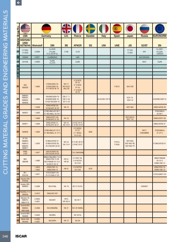 348 ISCAR CUTTING MATERIAL GRADES AND ENGINEERING MATERIALS Material Group No.USA Germany U.K. France Sweden Italy Spain Japan Russia EURONORMAISI/SAE/UNS/ASTM/AA Werkstoff DIN BS AFNOR SS UNI UNE JIS GOST EN28 C11000;C12200 2.0090Cu-DHP;E-Cu58;E Cu 58 SF-CuC106 Cu-B C1100;C1220 M1fCu-DHP;E-Cu58; CW024A28 C95500 2.0971 CuAl9Ni3Fe2 UA9 BrA10Zh4N4L28 C61000 2.0920 CuAl8;Cu Al 8 CuAl8 BrA7 CuAl82929303031 330;N08330 1.4864X12NiCrSi35-16;X12NiCrSi36-16;X12 NiCrSi 36 16NA 17;INCOLOY alloy DSZ 20 NCS 33-16;Z 12 NCS 37-18;Z 12 NCS 35-16F.3313 SUH 33031N08002;N08004;N08005;N080301.4865GX40NiCrSi38-19 GX40NiCrSi38-18;G-X40 NiCrSi38 18330 C 11;330 C 40;331 C 40GX 50 NiCr 39 19 SCH 15;SCH 16 GX40NiCrSi38-1831 1.4558 X2NiCrAlTi32-20;X2 NiCrAITi 32 20 NA 15 NCF 800 X2NiCrAlTi32-2031 N08031 1.4562 X1NiCrMoCu32-28-7;X1 NiCrMoCu 32 28 7X1NiCrMoCu 32-28-731 1.4958 X5NiCrAITi31-20;X5 NiCrAITi 31 20 NA 15 NCF 800 H;NCF 718 X5NiCrAITi31-2031 N08811 1.4959 X8NiCrAlTi32-21;X8 NiCrAlTi 32 21NA 15;NA 15 HZ 8 NC 33-21;Z 10 NC 32-21 X8NiCrAlTi32-2131 N08028 1.4563 X1NiCrMoCu31-27-4;X1 NiCrMoCu 31 27 4Z 2 NCDU 31-27;Z 1 NCDU 31-27-032584 EK77;ChN30MDBX1NiCrMoCu 31-27-431B 163;N08800;N08810;N08332;N088111.4876X10NiCrAlTi32-21;X10NiCrAlTi32-20; X10 NiCrAlTi 32 20NA 15;NA 15 HZ 10 NC 32-21;Z 8 NC 33-21F.3314;F.3545NCF 800;NCF 800 TB;NCF 800 TPX10NiCrAlTi32-2132 S590;J 467 1.4977 X40CoCrNi20-20;X40 CoCrNi 20 20 Z 42 CNKDWNb32 660;S66286 1.4980X6NiCrTiMoVB25-15-2;X5NiCrTi26-15 X6 NiCrTiMoVB 25 15 2;X5 NiCrTi 26 15HR 51;HR 52Z 3 NCT 25;Z 6 NCTDV 25.15 BX6NiCrTiMoVB 25-15-2;X5NiCrTi26-1532 1.4943;1.4944X4NiCrTi25-15;X5NiCrTi26-15 HR 51 Z 6 NCTDV 25-15 B 2570 X4NiCrTi25-15;X5NiCrTi26-1532 661;R30155 1.4971 X12CrCoNi21-20;X12 CrCoNi 21 20 X12CrCoNi21-2032 Haynes 556;R3055633Incoloy 825;N08825; 2.4858 NiCr21Mo NA 16 NC 21 Fe DU ChN38VT33 Hastelloy C-4;N06455 2.4610 NiMo16Cr16Ti33Nimonic 75;N06075;AMS 57152.4630;2.4951 NiCr20Ti HR 5;HR 203-4 NC 20 T33Inconel 625;N06625;AMS 56662.4856 NiCr22Mo9Nb NA 21 NC 22 FeDNb33 Inconel 690;N06690 2.4642 NiC29Fe NC 30 Fe33 Monel 400;N044002.4360;2.4361 NiCu30Fe NA 13 NU 30