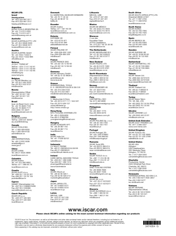 www.iscar.comPlease check ISCAR%u2019s online catalog for the most current technical information regarding our products01/20253474354 G 3474354%u201c%u00a9 2013 Iscar Ltd. This document, as well as all information and other data contained herein and/or derived therefrom, including but not limited to, all trademarks, logos, trade-names, concepts, pictures, designs and/or devices, as well as any data from which any proprietary and/or intellectual property right may emanate (%u201cInformation%u201d), is the sole and exclusive property of Iscar Ltd. and is protected by copyright and other applicable laws. No part of any Information may be used or otherwise disseminated for any purpose whatsoever without the express prior written consent of Iscar Ltd.Items appearing in this catalog may be improved, amended or withdrawn without prior notice.%u201dISCAR LTD.IsraelHeadquartersTel +972 (0)4 997 0311Fax+972 (0)4 987 [email protected] TOOLS ARGENTINA SATel +54 114 912 2200Fax+54 114 912 [email protected] AUSTRALIA PTY. LTDTel +61 (0) 2 8848 3500Fax+61 (0) 2 8848 [email protected] AUSTRIA GmbHTel +43 7252 71200-0Fax+43 7252 [email protected] ALC %u201cTWING-M%u201dTel/Fax: +375 17 511 82 91Tel/Fax: +375 17 511 82 93Tel/Fax: +375 17 511 82 [email protected]. ISCAR Benelux s.a.Tel +32 (0) 2 464 2020Fax+32 (0) 2 522 [email protected](Representative Office)Tel +387 32 201 100Fax+387 32 201 [email protected] do Brasil Coml. Ltda.Tel +55 19 3826-7100Fax+55 19 3826-7171DDG 0800 701 [email protected] BULGARIATel/Fax +359 431 [email protected] TOOLS INC.Tel +1 905 829 9000Fax+1 905 829 [email protected]&A INTERNATIONAL Tel +56 2 2232 [email protected] CHINATel +86 21 8024 [email protected] AndinaTel +57 310 380 9932Tel/fax +57 1 896 65 [email protected] ALATI d.o.o.Tel +385 (0) 1 33 23 301Fax+385 (0) 1 33 76 [email protected] (Demetriades) Ltd.Tel +357 (0) 2 336660/5498Fax+357 (0) 2 [email protected] RepublicISCAR CR s.r.o.Tel +420 377 420 625Fax+420 377 420 [email protected] VAERKTOEJ AS/ISCAR DENMARKTel +45 70 11 22 44Fax+45 46 98 67 [email protected] AndinaTel/fax +57 1 821 93 [email protected]@iscar.com.coEstoniaKATOMSK ASTel +372 6775 671Fax+372 6720 [email protected] FINLAND OYTel +358-(0)9-439 1420Fax+358-(0)9-466 [email protected] FRANCE SASTel +33 (0)1 30 12 92 92Fax+33 (0)1 30 12 95 [email protected] Germany GmbHTel +49 (0) 72 43 [email protected] TOOLSK.-X. GEORGOPOULOS & SIA O.ETel +30 210 346 0133Fax+30 210 342 [email protected]. Mazloumian & SonsTel +30 2310 517-117 / 544-521Fax+30 2310 [email protected]://www.vimaco.grHong KongMTC TOOLING SYSTEMS LTDTel +85-2-23054838Fax+85-2-27988789yoongkamsing@hotmail.comHungaryISCAR HUNGARY KFT.Tel +36 28 887 700Fax+36 28 887 [email protected] India Ltd.Tel +91 77009 [email protected] MULTI TEKNIKTel +62-21-29206242/44/45/[email protected] METAL MACHINE TOOLSTel +353 (0) 1 286 2466Fax+353 (0) 1 286 [email protected] ITALIA srlTel +39 02 93 528 1Fax+39 02 93 528 [email protected] JAPAN LTD.Tel +81 6 6835 5471Fax+81 6 6835 [email protected], UABTel +370 37 407 230Fax+370 37 407 [email protected], UABTel +370 37 407 230Fax+370 37 407 [email protected] DE M%u00c9XICOTel +52 (442) 214 5505Fax+52 (442) 214 [email protected] rue des Fauvettes Oasis20103 CasablancaTel +212 (0) 7 62 23 48 [email protected] NetherlandsISCAR NEDERLAND B.V.Tel +31 (0) 182 535523Fax+31 (0) 182 [email protected] ZealandISCAR PACIFIC LTD.Tel +64 (0) 9 573 1280Fax+64 (0) 9 573 [email protected] Macedonia(Representative Office)Tel +389 2 309 02 52Fax+389 2 309 02 [email protected] MASKINER ASTel +47 32277750Fax+47 [email protected] SACTel: (511) [email protected] +63 2631 1775Fax+63 2635 [email protected] POLAND Sp. z o.o.Tel +48 32 735 7700Fax+48 32 735 [email protected] Portugal, SATel +351 256 579950Fax+351 256 [email protected] Tools SRLTel +40 (0)312 286 614Fax+40 (0)312 286 [email protected] TOOLS d.o.o.Tel +381 11 314 90 38Fax+381 11 314 91 [email protected] TOOLING SYSTEMTel +65 6566 7668Fax+65 6567 [email protected] SR, s.r.o.Tel +421 (0) 41 5074301Fax+421 (0) 41 [email protected] SLOVENIJA d.o.o.Tel +386 1 580 92 30Fax+386 1 562 21 [email protected] AfricaISCAR SOUTH AFRICA (PTY) LTD.ShareCall 08600-47227Tel +27 11 997 2700Fax+27 11 388 [email protected] KoreaISCAR KOREATel +82 53 760 7594Fax+82 53 760 [email protected] IBERICA SATel +34 93 594 6484Fax+34 93 582 [email protected] SVERIGE ABTel +46 (0) 18 66 90 60Fax+46 (0) 18 122 [email protected] HARTMETALL AGTel +41 (0) 52 728 0850Fax+41 (0) 52 728 [email protected] Taiwan Ltd.Tel +886 (0)4-24731573Fax+886 (0)[email protected] Thailand Ltd.Tel +66 (2) 7136633-8Fax+66 (2) [email protected] Kesici TakimTIC. VE. IML. LTDTel +90 (262) 751 04 84 (Pbx)Fax+90 (262) 751 04 [email protected] UKRAINE LLCTel +38 (050) 440 23 [email protected] Arab EmiratesISCAR GULF TRADING LLCTel +971 4 886 4547www.svrs-mena.comUnited KingdomISCAR TOOLS LTD.Tel +44 (0) 121 422 8585Fax+44 (0) 121 423 [email protected] StatesISCAR USAArlingtonUSA Headquarters300 Westway PlaceArlington, TX 76018Tel +1 [email protected] Center3020 Whitehall Park DriveCharlotte, NC 28273Tel +1 817 [email protected] ISO-DIN C.A.Tel +58 2 632 8211/633 4657Fax+58 2 632 [email protected] VIETNAM(Representative Office)Tel +84 8 38 123 519/20Fax+84 8 38 123 [email protected]