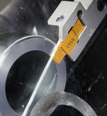 刀具系统与刀片J-型断屑槽的结合,使得能实现每转0.1 mm/rev的进给,高压冷却(JHP)系统最大冷却压力为340 bar。刀片采用了IC1008合金牌号(基体为IC08,刀片表面采用了TiAlN PVD涂层)。