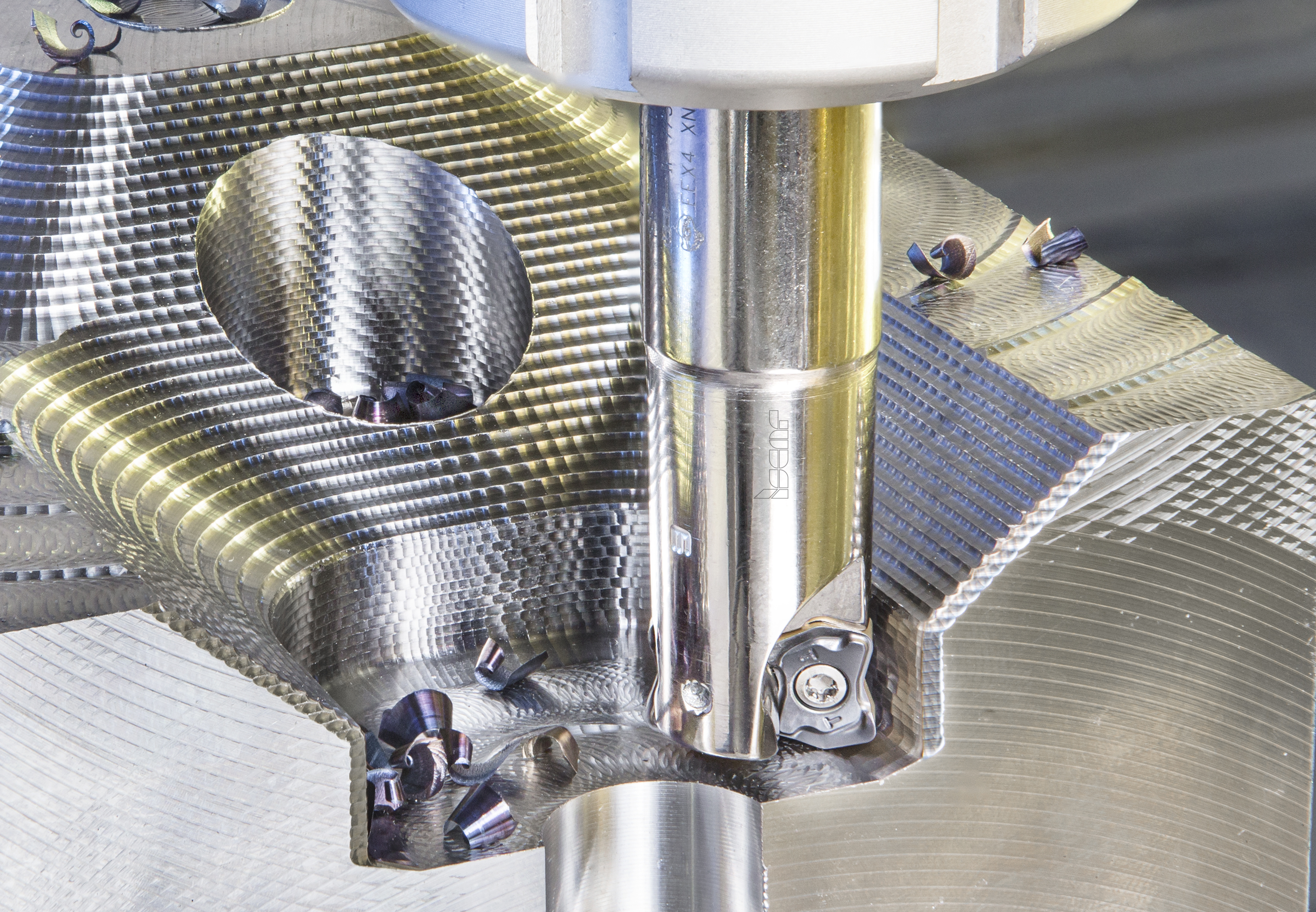 Com a ajuda de máquinas-ferramentas modernas, a fresagem altamente produtiva de ligas de alumínio pode ser alcançada em velocidades de fuso extremamente altas, atingindo até 33000 rpm. Para atender a esse desafio de usinagem, a ISCAR desenvolveu fresas de fresagem intercambiáveis de 90° que acomodam pastilhas de grande tamanho para uma profundidade de corte de até 22 mm (.870") (Fig. 2). As fresas foram especificamente projetadas para eliminar o deslocamento radial da pastilha, que pode ocorrer devido às altas forças centrífugas geradas durante velocidades rotacionais muito altas.